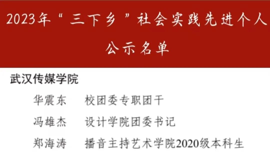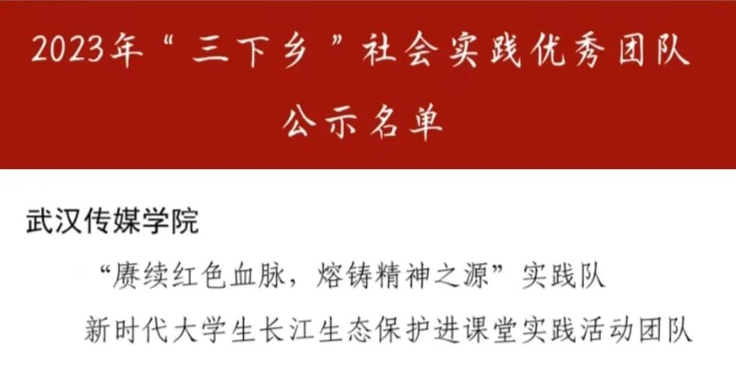 其中永利集团“赓续红色血脉,熔铸精神之源”实践队、新时代大学生长江生态保护进课堂实践活动团队荣获湖北省2023年“三下乡”社会实践优秀团队。校团委书记华震东老师、设计学院团委书记冯雄杰老师以及播音主持艺术学院2020级本科生郑海涛同学获得湖北省2023年“三下乡”社会实践先进个人。