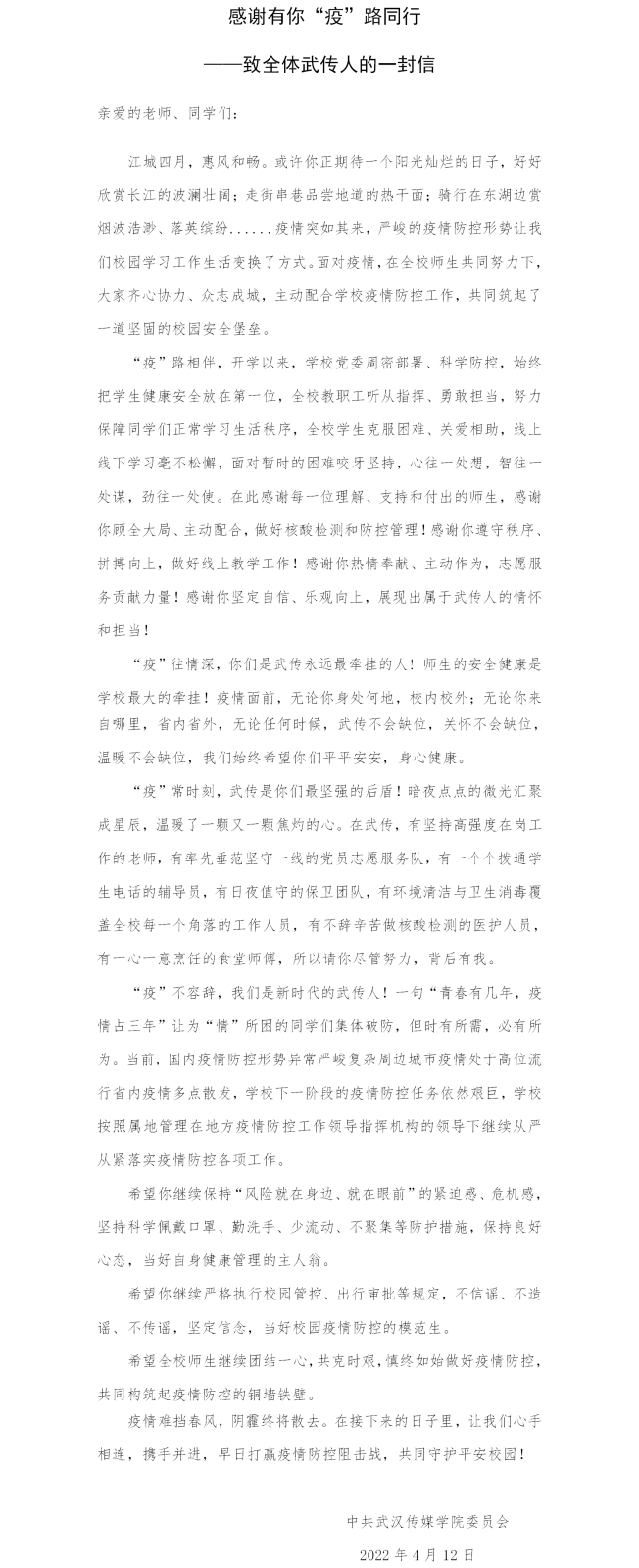感谢有你“疫”路同行 ——致全体武传人的一封信