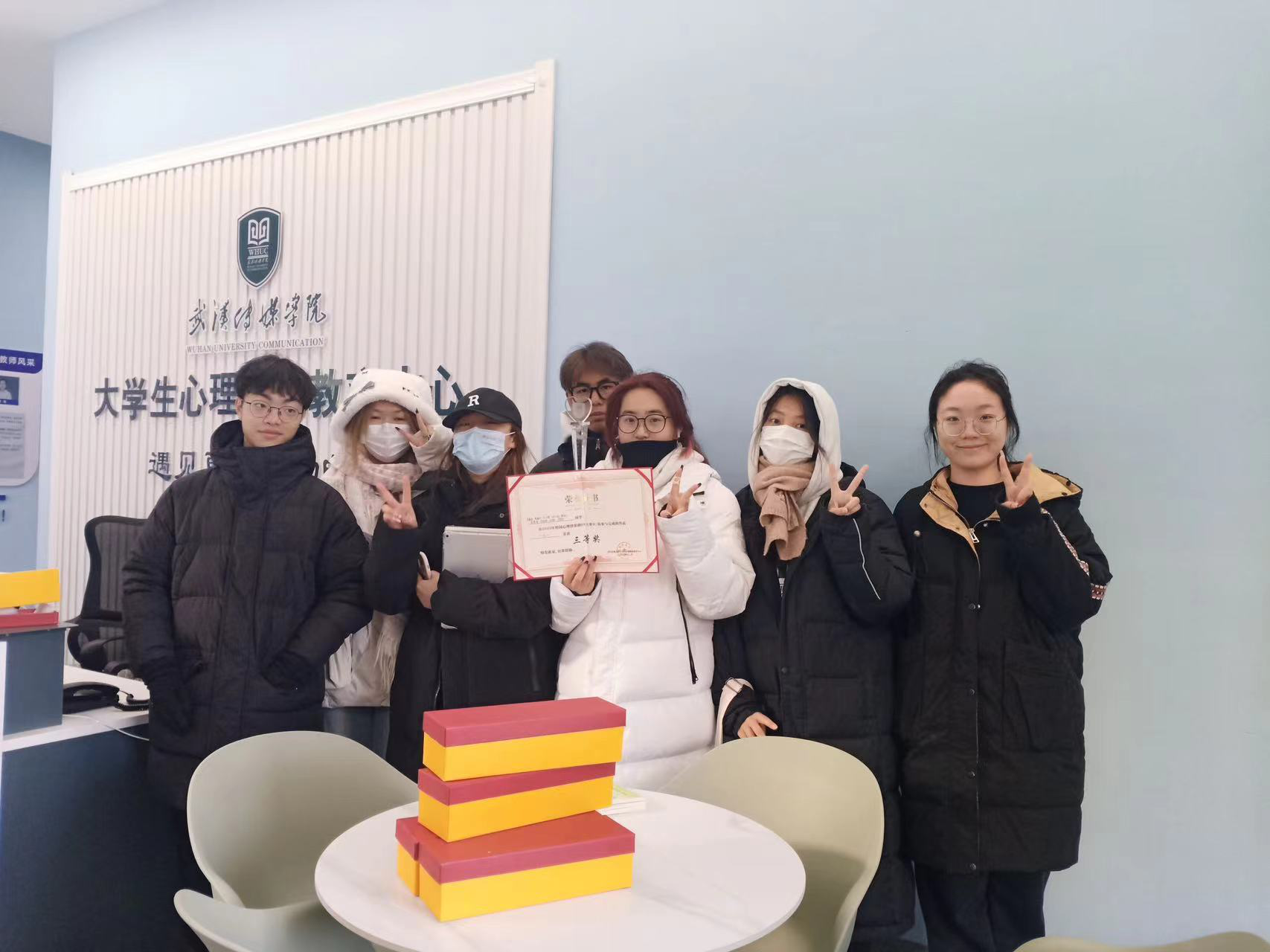 大赛结果公布后,获奖学生前往心理中心领取证书、奖杯并合影留念。