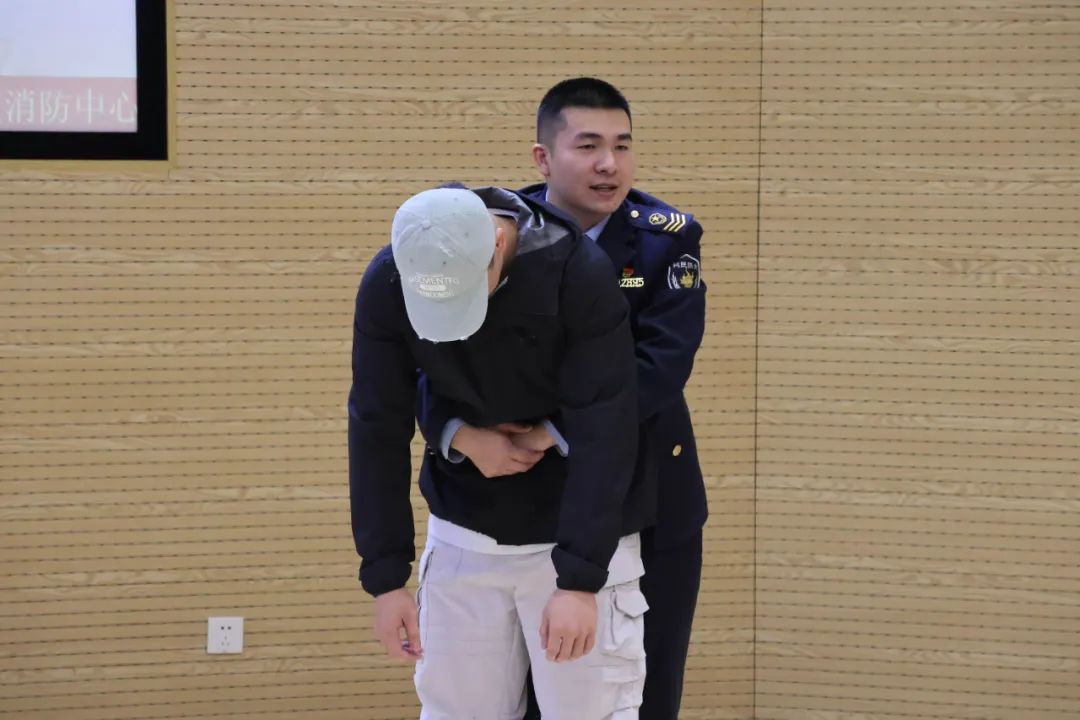 讲座开始时,孙教官首先介绍了海姆立克急救法,并邀请同学上台进行急救法示范。通过讲解和实际操作,同学们掌握了有效的自救技巧,能够在被食物或异物卡喉的情况下迅速施救,减轻对受害者生命的威胁。