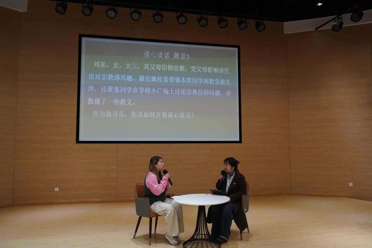 “谈心谈话”环节以情景再现的方式让参赛辅导员围绕主题与助演学生进行深度交谈。辅导员们用扎实的理论功底、专业的沟通技巧、真挚的情感表达展示了他们的育人情怀和以身作则的责任担当。面对学生遇到的问题,他们能够结合自身经验,沉着应对,积极开展教育引导,耐心且精准地解决学生身心问题,展现良好的职业素养。