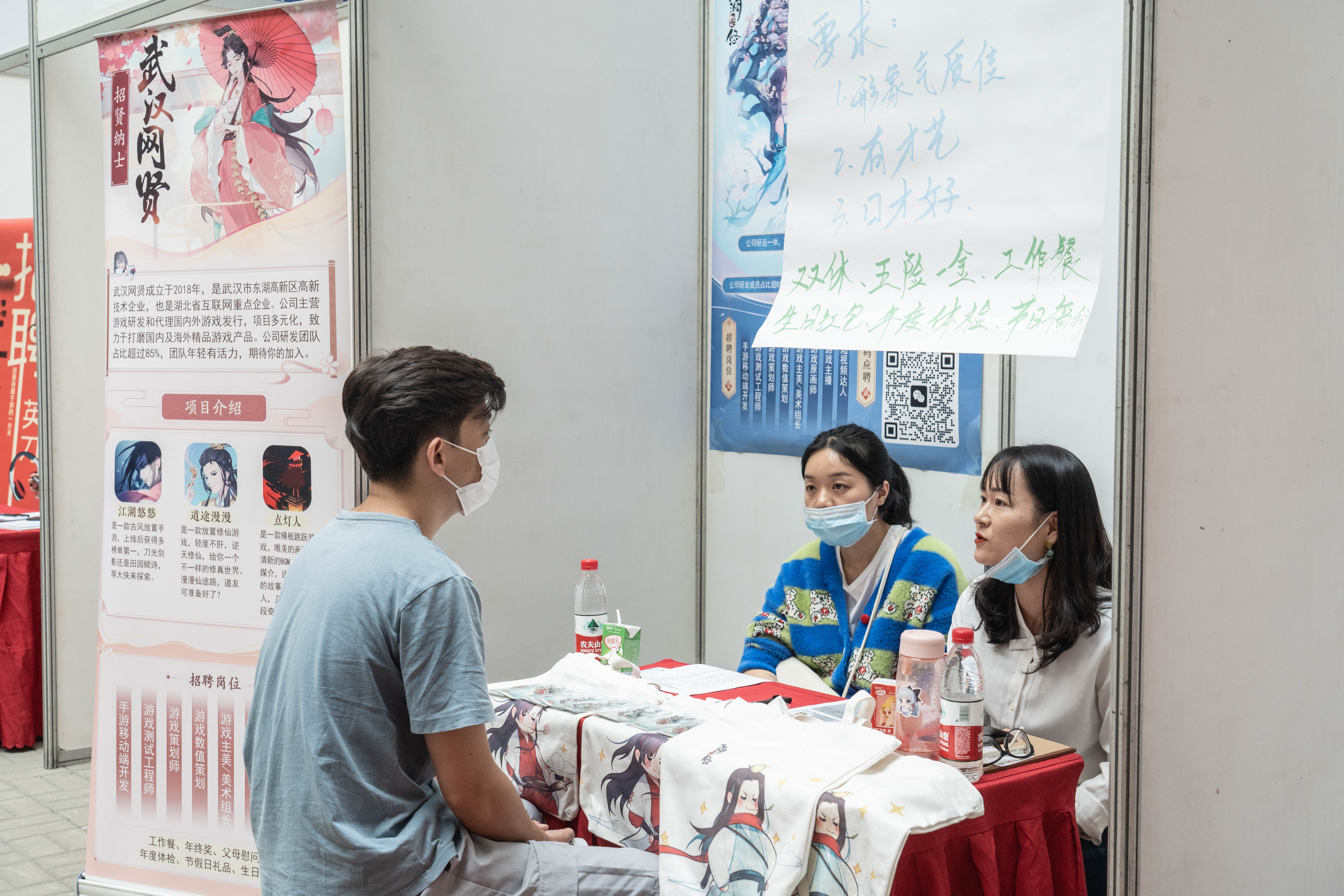 招聘会首日,46家用人单位按时到场,2022届应届毕业生陆续到现场。前来应聘的毕业生大都精心打扮,力求以最好的形象给面试官留下好的印象。个性海报、彩色气球、可爱口罩……,用人单位为吸引应届毕业生各出“奇招”,现场互动气氛热烈。此外,本次招聘会现场还出现了一些“老面孔”,例如武汉素然文化传媒有限公司等。