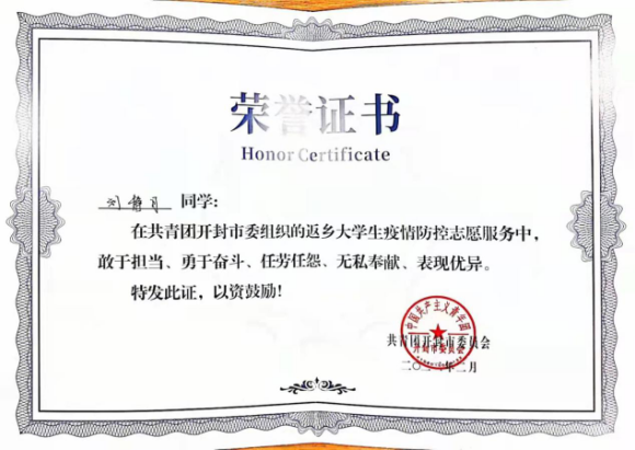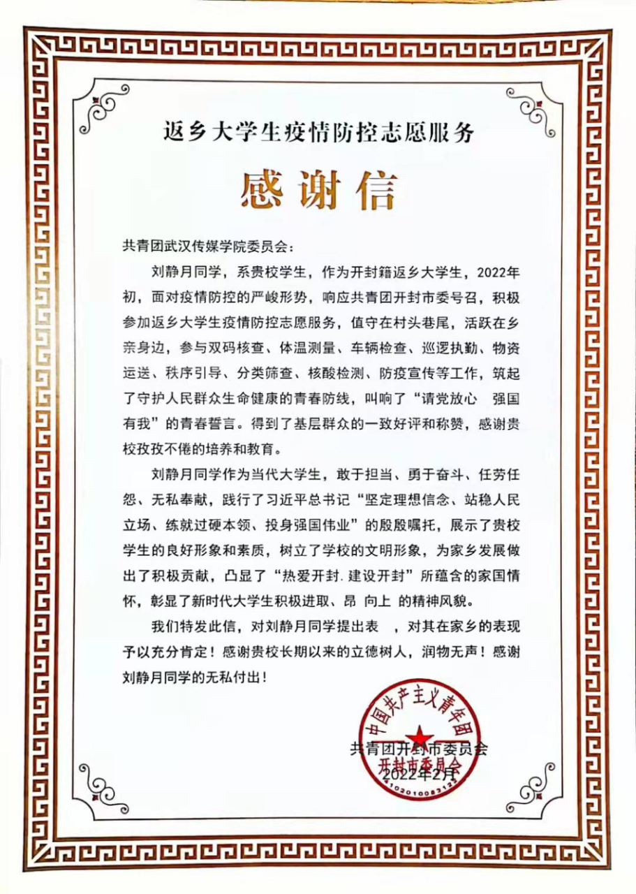 (武传新闻网讯 记者 石佳 )“感谢刘静月同学为家乡做出了积极的贡献,凸显了‘热爱开封,建设开封’所蕴含的家国情怀,彰显了新时代大学生积极进取,昂扬向上的精神风貌”。这是来自共青团开封市委发来的一封感谢信,对永利集团电影与电视学院广播电视编导B2103班的刘静月同学以高度的热情和激情,积极投身家乡疫情防控工作的志愿服务精神给予了充分肯定。