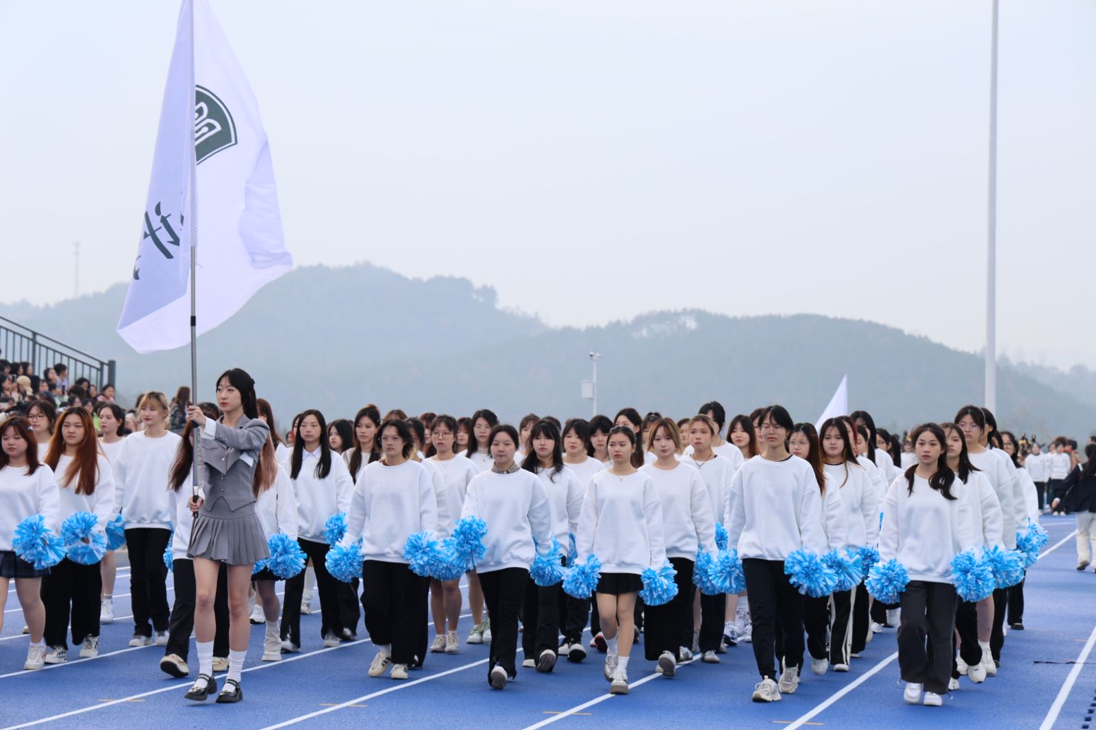 随着各学院代表方队的演出落幕,大悟校区行政代表队、裁判员代表队依次入场,在观众的注视和掌声中依次经过主席台接受校领导的检阅。