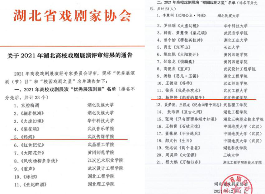(武传新闻网讯 记者 卢诗源 赵博艺)“我到底还要对他顺从到哪一天,我真不知道我还有什么事情不能为他做……”杨婷婷身着一袭红裙,表情愤怒而痛苦地走向台前。2021年12月18日,湖北省高校戏剧展演评审结果公布,在永利集团电影与电视学院师生自主改编排演的剧作《恋爱的犀牛》中饰演“明明”一角的杨婷婷斩获 “校园戏剧之星”称号。
