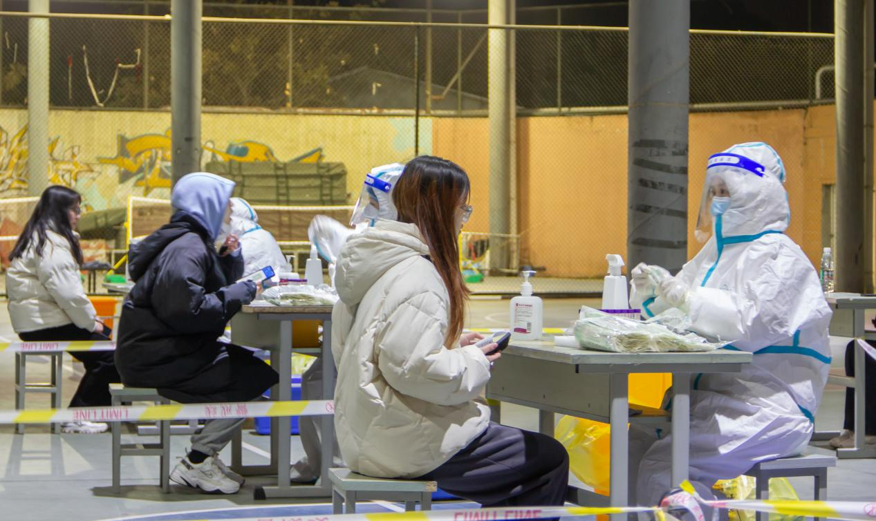 核酸检测现场,学生志愿者协助医护人员,维持场内秩序,引导大家一一扫码核验身份,以十人为一组有序前往采样点。
