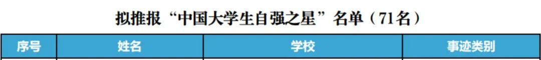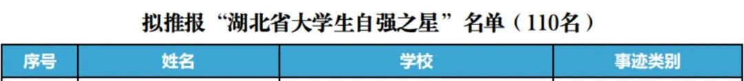 经高校申报、省级遴选、宣传展示、专家评审等环节,拟推报“湖北省大学生自强之星标兵”10名、“湖北省大学生自强之星”110名,并拟从中择优等额推报71名学生参加“中国大学生自强之星”评选(含1名“中国大学生自强之星标兵”)。