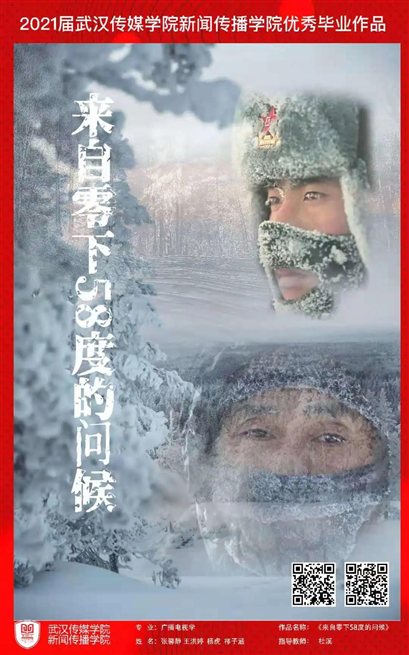 《来自零下58度的问候》由广播电视学专业2021届毕业生王洪婷、张馨静、杨虎和祁子涵共同拍摄完成,讲述了呼伦贝尔根河,林场护林人姜丰海、驯鹿守护员葛顺江、冷极村留守者程善忠,在恶劣环境下依然默默坚守岗位的故事。