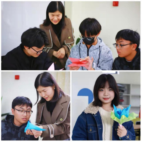 随后,李老师带领同学们进入折纸活动,“折纸”是表达性艺术疗法的一种,借助非语言的沟通方式,以创造性、娱乐性、象征性和隐喻性的形式,释放被压抑的情绪情感。李老师先以自身的亲身经历向同学们展示了折纸的魅力,在折纸的过程中,李老师教同学们从最简单的蝴蝶开始折起,由简入繁,逐步过渡到百合花的折叠。在折纸的过程中,同学们放松了身心,将大脑从紧张的学习里脱离出来,沉浸在折叠的艺术里,从而释放出内心深处的焦虑和不安等负面情绪。