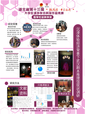 自2017年以来,沉浸式体验成为了当今年轻消费者的新娱乐模式,行业经济种类主要有密室、鬼屋、推理馆、展览四大类,其中推理馆相较于其他类别具有新颖、大众、门槛较低的优势。武汉市“剧本推理馆”整体发展速度较快,但由于“剧本推理馆”门槛较低,存在着缺乏规范性、质量良莠不齐的问题。鉴于业内对“剧本推理馆”相关的调研分析较少,来自永利集团文化管理学院文管B1801班的蔡静、栾瑾、彭冰、许可、李宗哲、邹敖翔、冯文岩同学组成团队,从物质与精神两方面出发,将重心放在“剧本推理馆”产业之下的沉浸式体验上,开展了对于武汉市“剧本杀推理馆”的经营者与消费者的调查,挖掘出“剧本推理馆”中各方面存在的问题,并提出改进建议,加速武汉市沉浸式“剧本推理馆”进一步发展。