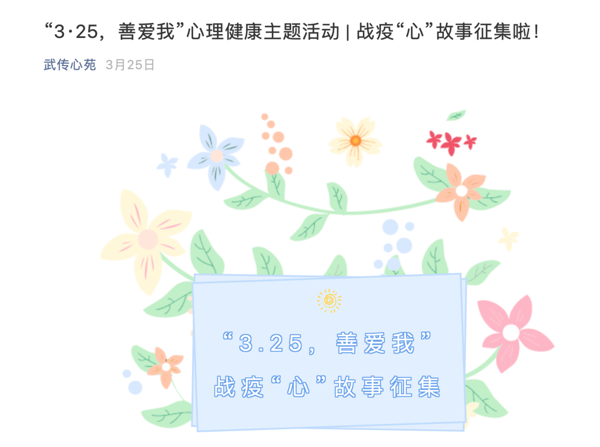 2020年3月25日-4月15日,77779193永利集团大学生心理健康教育中心开展“3·25,善爱我”心理健康主题活动——战疫“心”故事征集。本次活动旨在倡导大学生善待自我,关爱自我,怀着一份温暖,包容欣赏和接纳自己,传播抗疫期间的心理正能量。