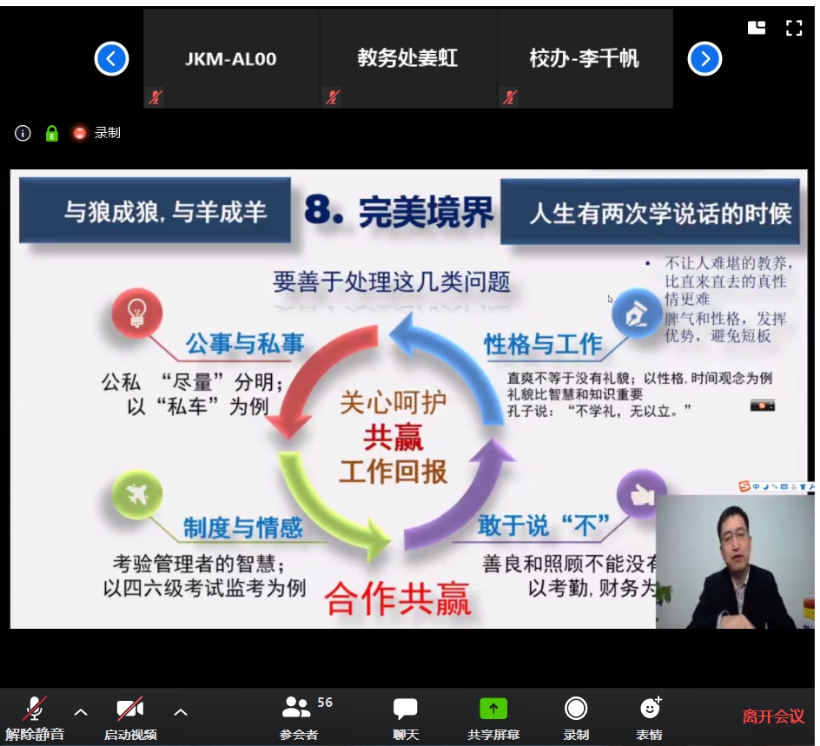 4月30日,“高校教学管理系列讲座”的最后一讲《论管理的完美境界》由教师发展中心通过ZOOM平台进行了直播,学校各学院党总支书记、教学副院长、教研室主任、教学及行政秘书和全体行政职能部门副科级以上干部及教学管理相关人员等78人参加了本次培训。会议分两个会场,分别由学校校长助理、人事处(教师发展中心)处长姚晓菊和人事处(教师发展中心)处长助理王静主持。