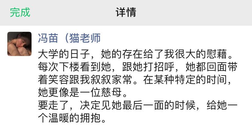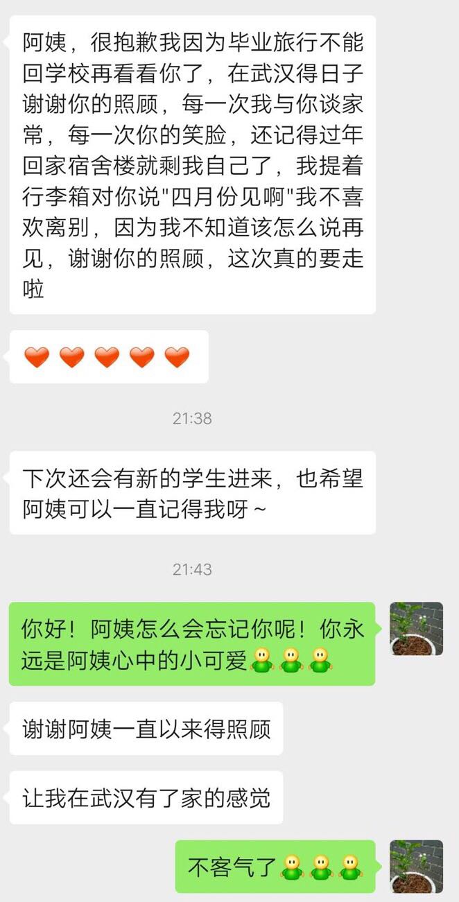 收到花的熊阿姨感到意外和感动,“这栋楼好多学生,我都能叫出她们的名字和寝室号”,此次送花的两位同学,她更是了然于心。虽然此前在母亲节、圣诞节等节日也收到过学生送的花,但是这一次在毕业之际,这束玫瑰让熊阿姨难以忘怀。想到与学生们相处的点点滴滴,熊阿姨说:“她们就是我的孩子。她们喜欢和我接触,好多学生加了我的微信;每次不管在校内还是校外遇见都会亲切地和我打招呼;这次疫情影响返校,她们就在微信里跟我聊天,互相鼓励。”