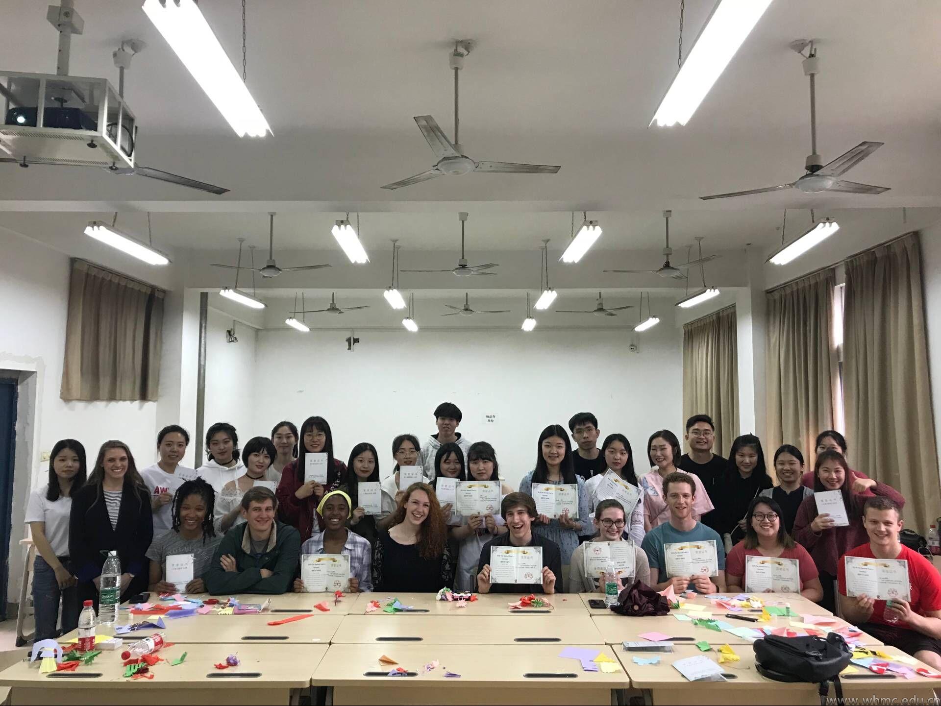 饺子宴过后,交流生参加了当日举办的诗词大赛,交流生与永利集团学生共同进行了“诗词你说我猜”和“传声筒游戏”环节。交流生们流利的中文发音赢得学生们的一片掌声,也很快与现场学生观众熟络起来。随后的中美友谊赛颁奖典礼上,人文与艺术学院为美国友人了准备了精美礼品并拍照留恋。