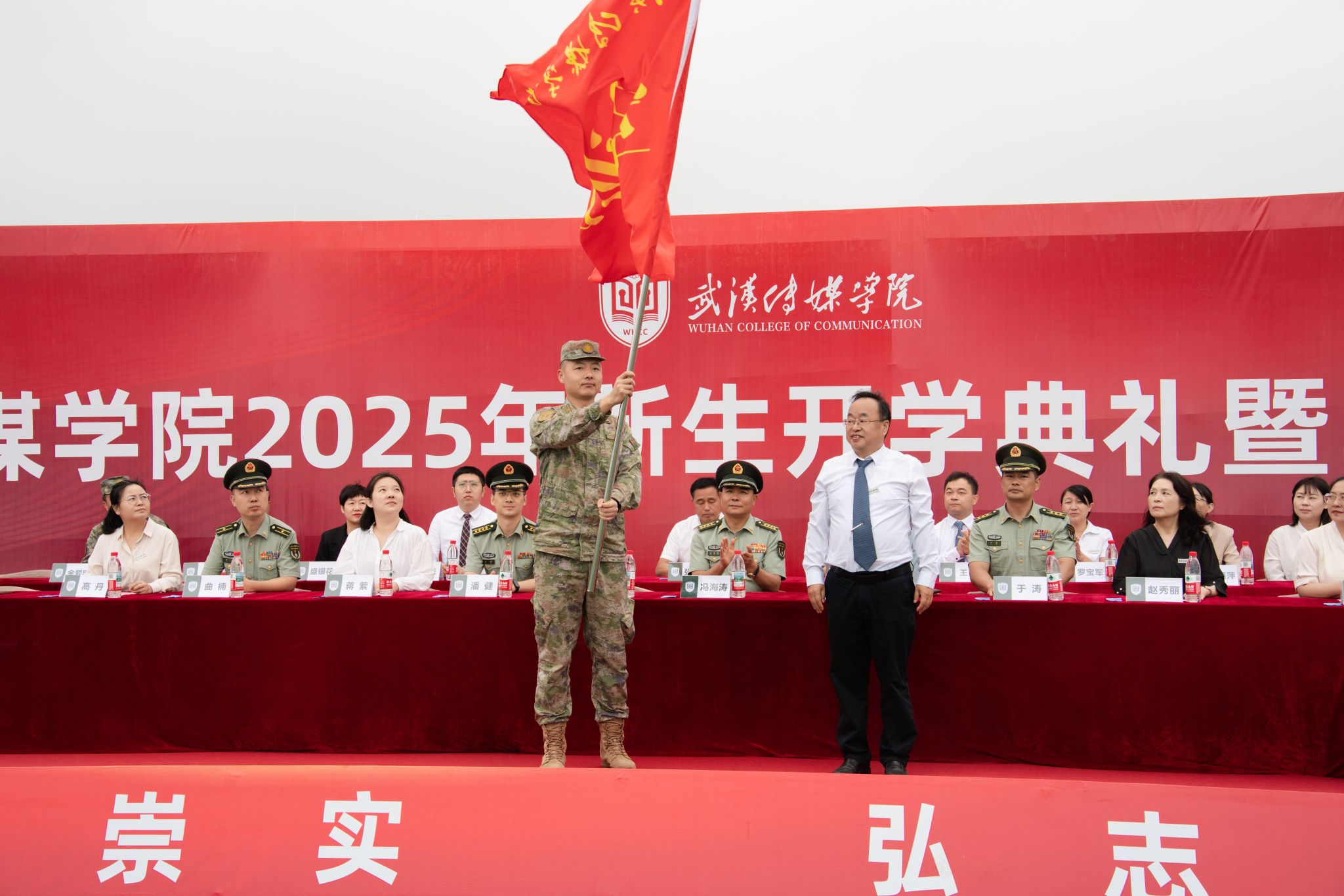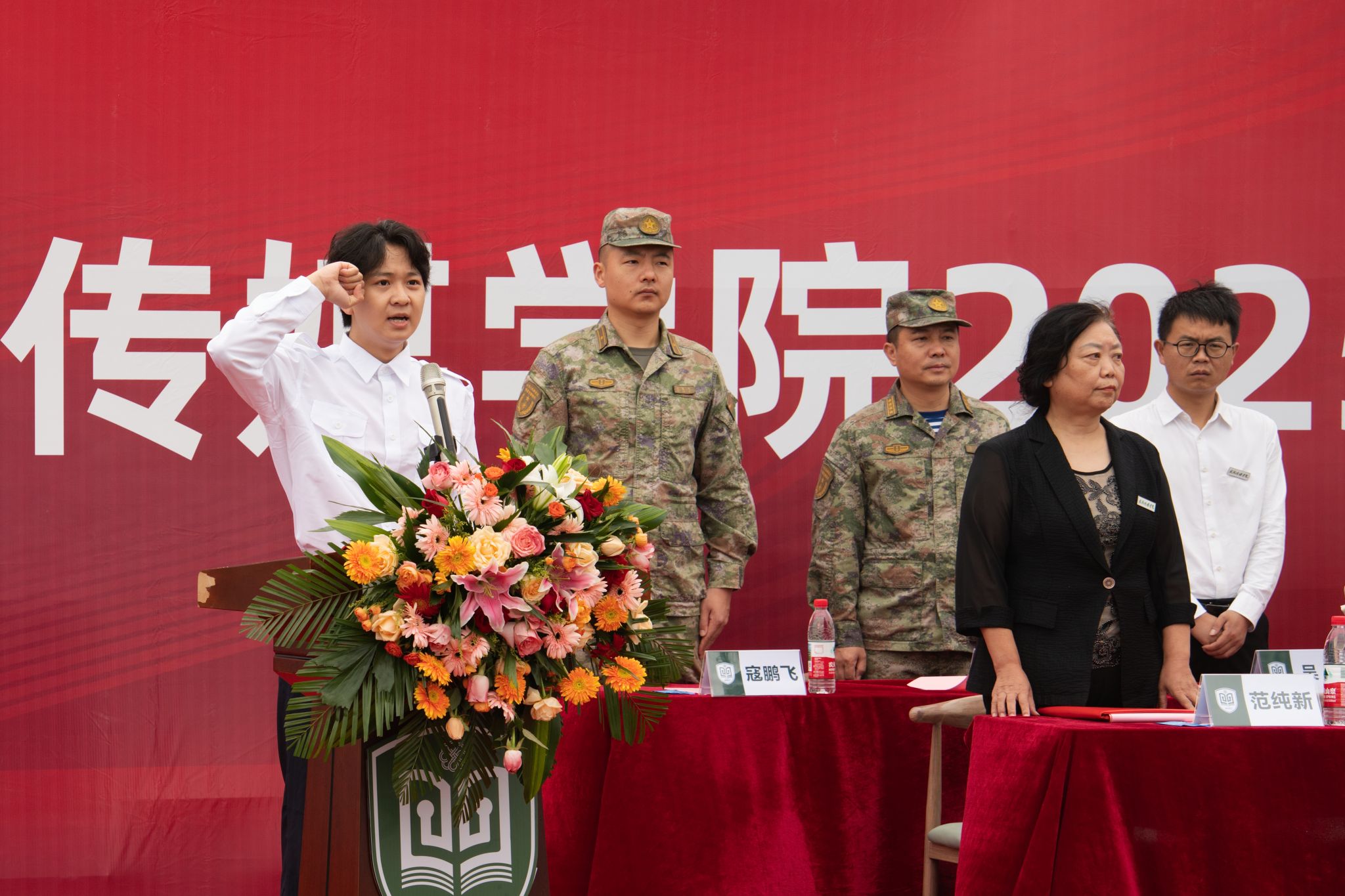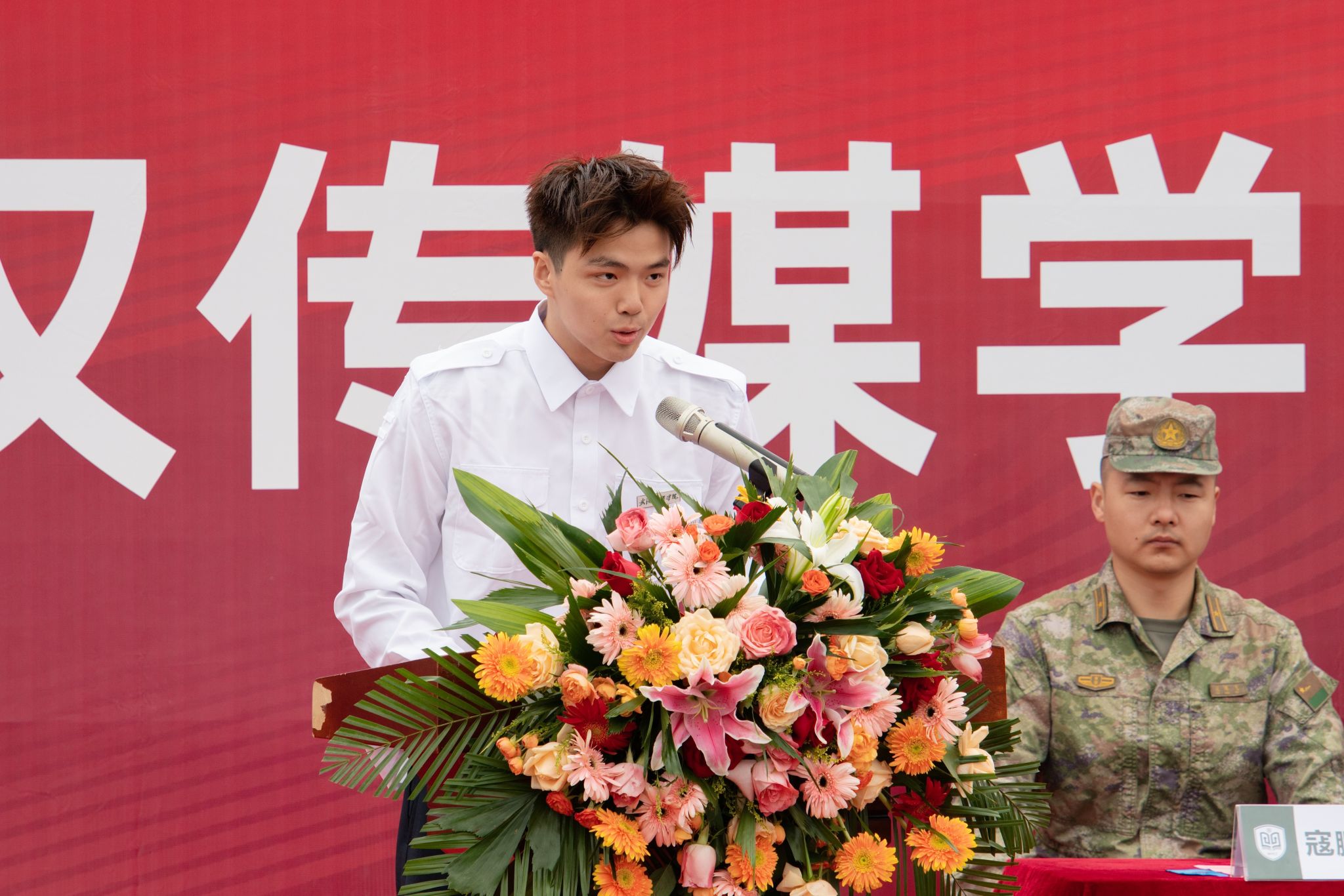 在慷慨激昂的《义勇军进行曲》中,耀眼的五星红旗在万众瞩目中冉冉升起。在学生代表梁津硕的带领下,全体新生佩戴上那一抹象征着希望、传承与生机的“武传绿”校徽并庄严宣誓:“向阳向上,奋斗以成。生逢盛世,重任担当。我将秉承博雅、崇实、弘志、拓新校训,勤奋好学,练就本领,勇敢担负时代使命,谱写属于新时代传媒人的绚丽华章......”一句句誓言,是对未来的期望,是对梦想的忠诚,对初心的炽热。