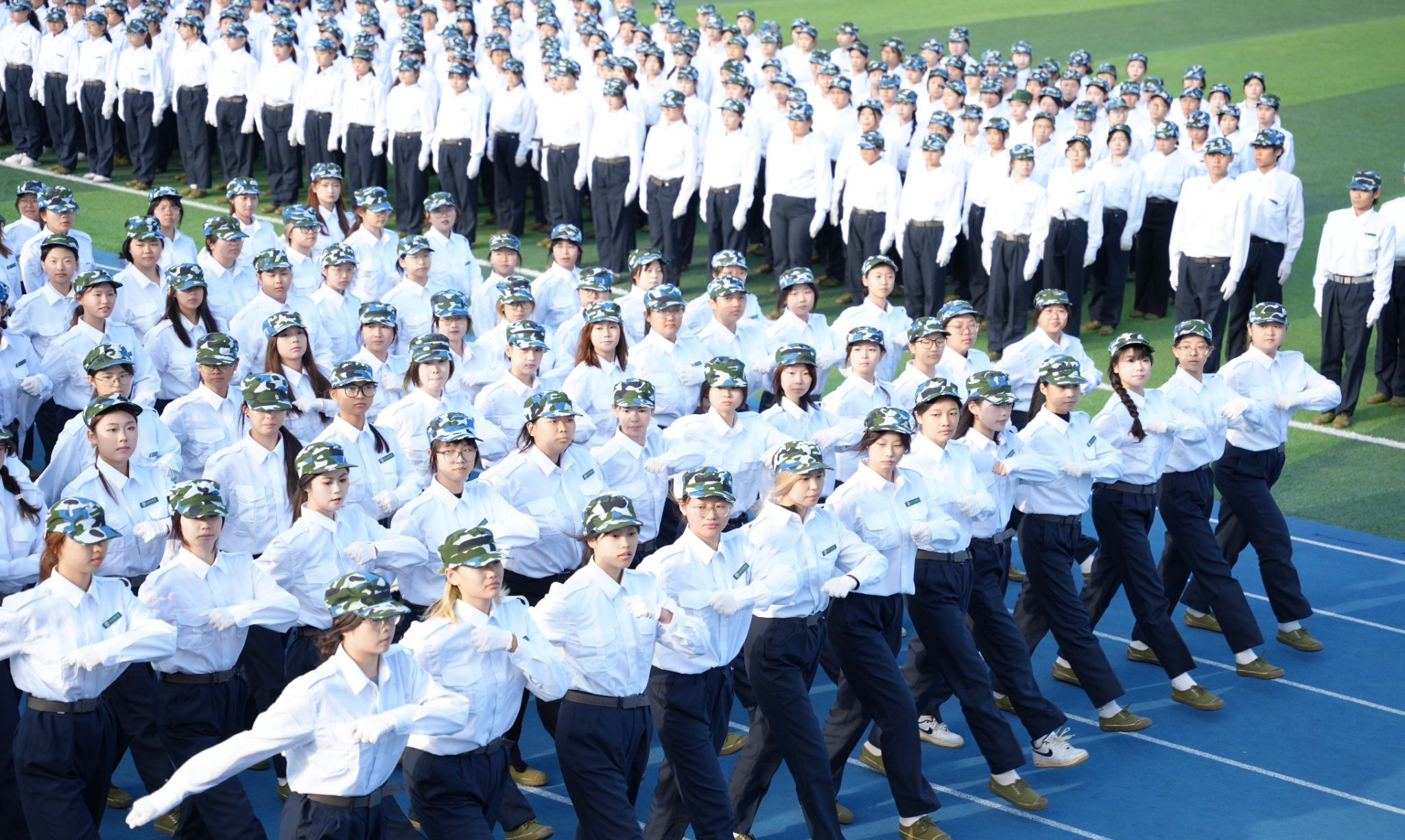 在随后的军训成果展示环节,2025级新生以饱满的热情和整齐的动作,展示了为期两周的军训成果。分列式表演中,各连队方阵步伐铿锵、口号响亮,依次走过主席台,接受检阅。军体拳表演刚劲有力,动作整齐划一,彰显了新时代大学生的阳刚之气和报国之志。