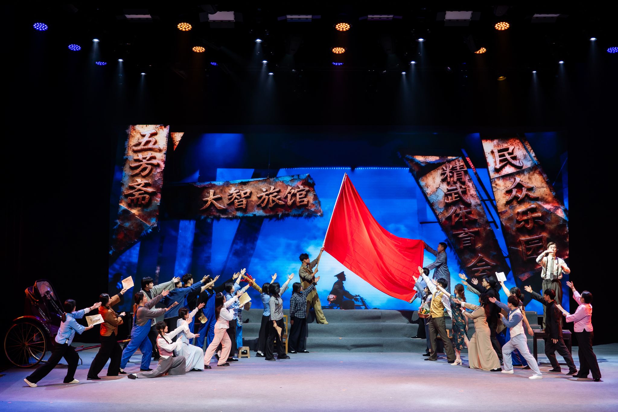 就连饰演报童的小演员,也以灵动的肢体、清脆的吆喝,展现出普通民众参与抗战的热情;张露萍的扮演者作为教唱教员,带领“群众”演唱《义勇军进行曲》时,手势有力、歌声嘹亮,将动员民众的感染力传递到剧场每一个角落。