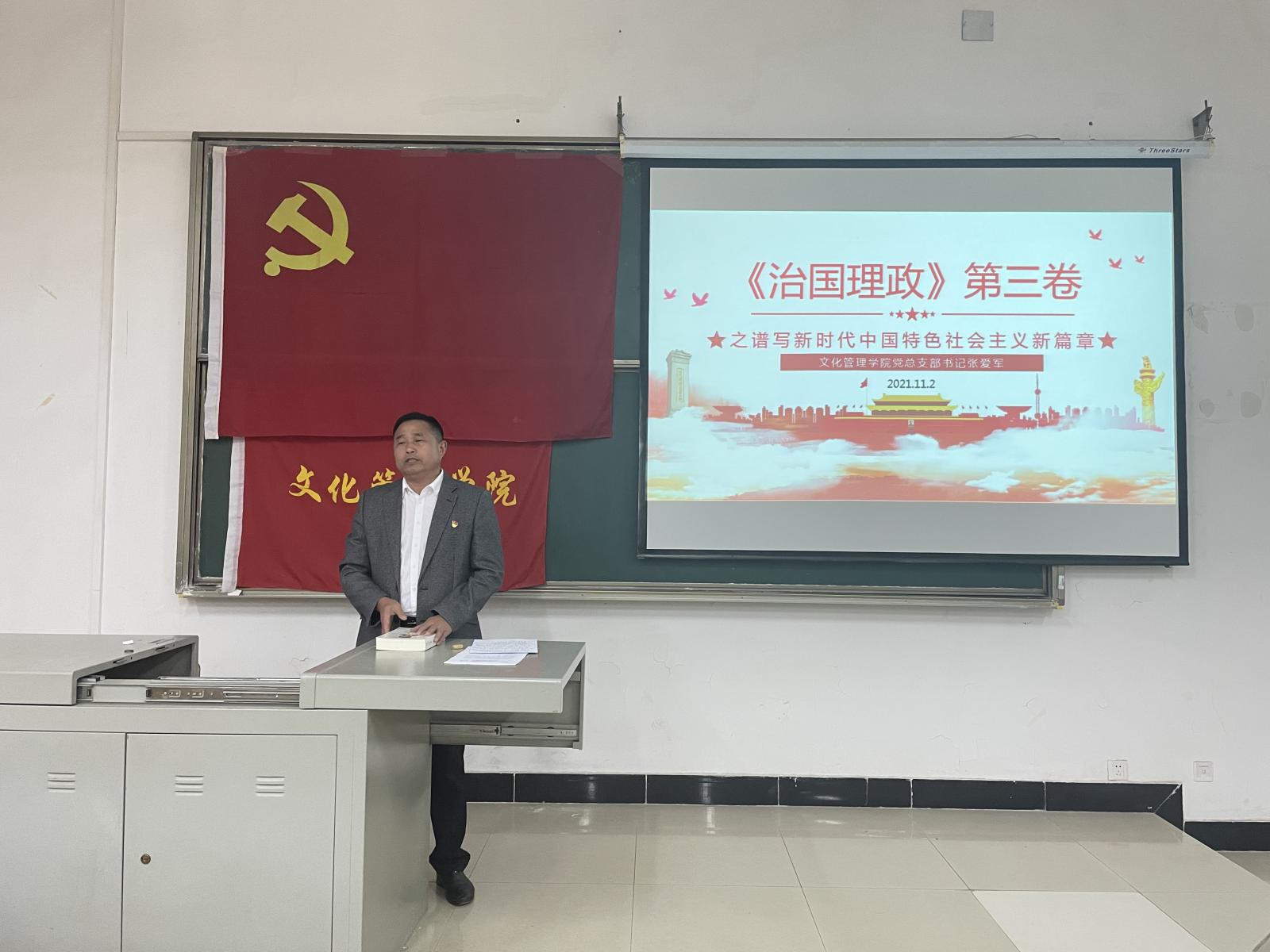 为了深入学习《习近平谈治国理政》第三卷,文化管理学院党总支部于2021年11月2日晚17点30分在5204教室开展了《习近平谈治国理政》第三卷之新时代中国特色社会主义新篇章主题党课,本次党课由文化管理学院党总支书记张爱军主讲,文化管理学院学生第一支部书记王喆、学生第二支部书记陈可冉以及党校预备党员、发展对象、入党积极分子参加了本次党课培训。