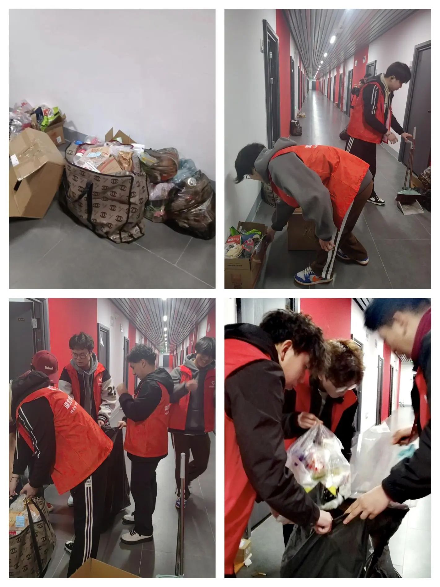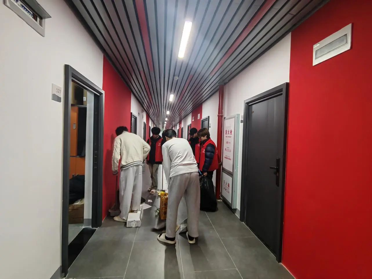志愿者们身穿红马甲,手持扫把和簸箕到各自指定的楼层开始进行清扫,并且善意提醒同学们注意寝室卫生、普及相关消防安全知识。