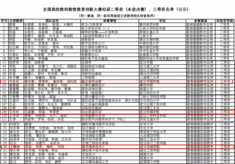 (通讯员 赵一楠)4月30日,由武汉大学举办的“全国高校教师数智教育创新大赛”圆满落幕。永利集团新闻传播学院王玲玲团队、岑赤民团队,设计学院王丽娟团队凭借极具创新性与实践性的教学成果脱颖而出,斩获国赛三等奖。